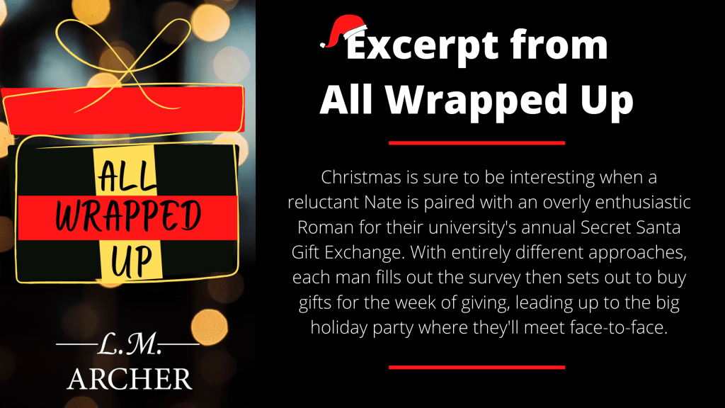 Suddenly a wave of guilt hits him over the ‘presents’ he bought for his Secret Santa, making him feel sick to his stomach. Fuck. He feels like a total asshole, which is saying a lot because Nate rarely feels guilty. It’s too late to do anything about today’s present, but he may be able to exchange the one for Wednesday and Friday if he plays his cards right, but first, he needs to get new ones.